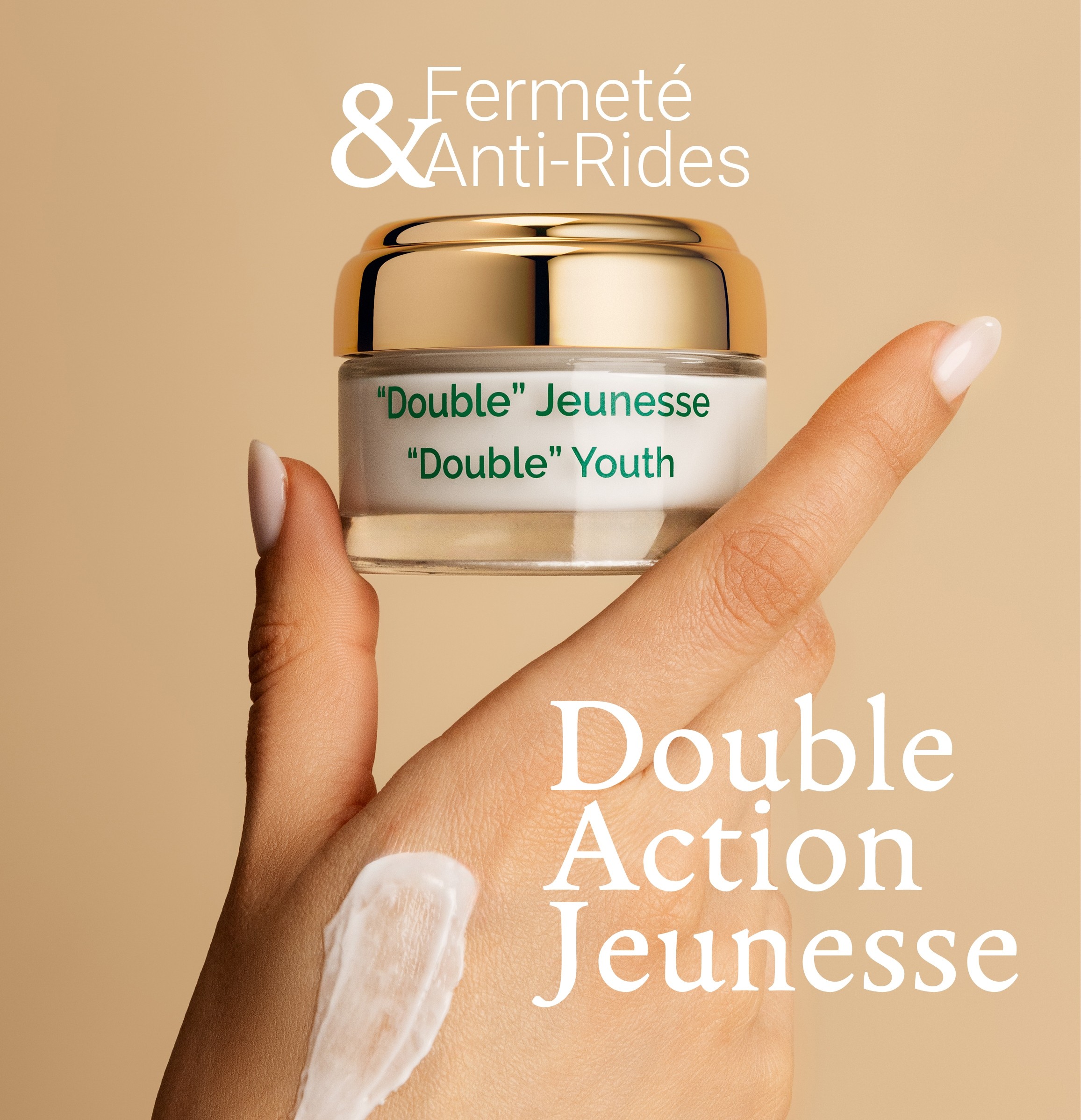 "Double" Jeunesse favorise la régénération, améliore la fermeté et optimise l’hydratation. Les rides sont lissées, la peau paraît plus dense, le teint plus homogène et revitalisé durablement.